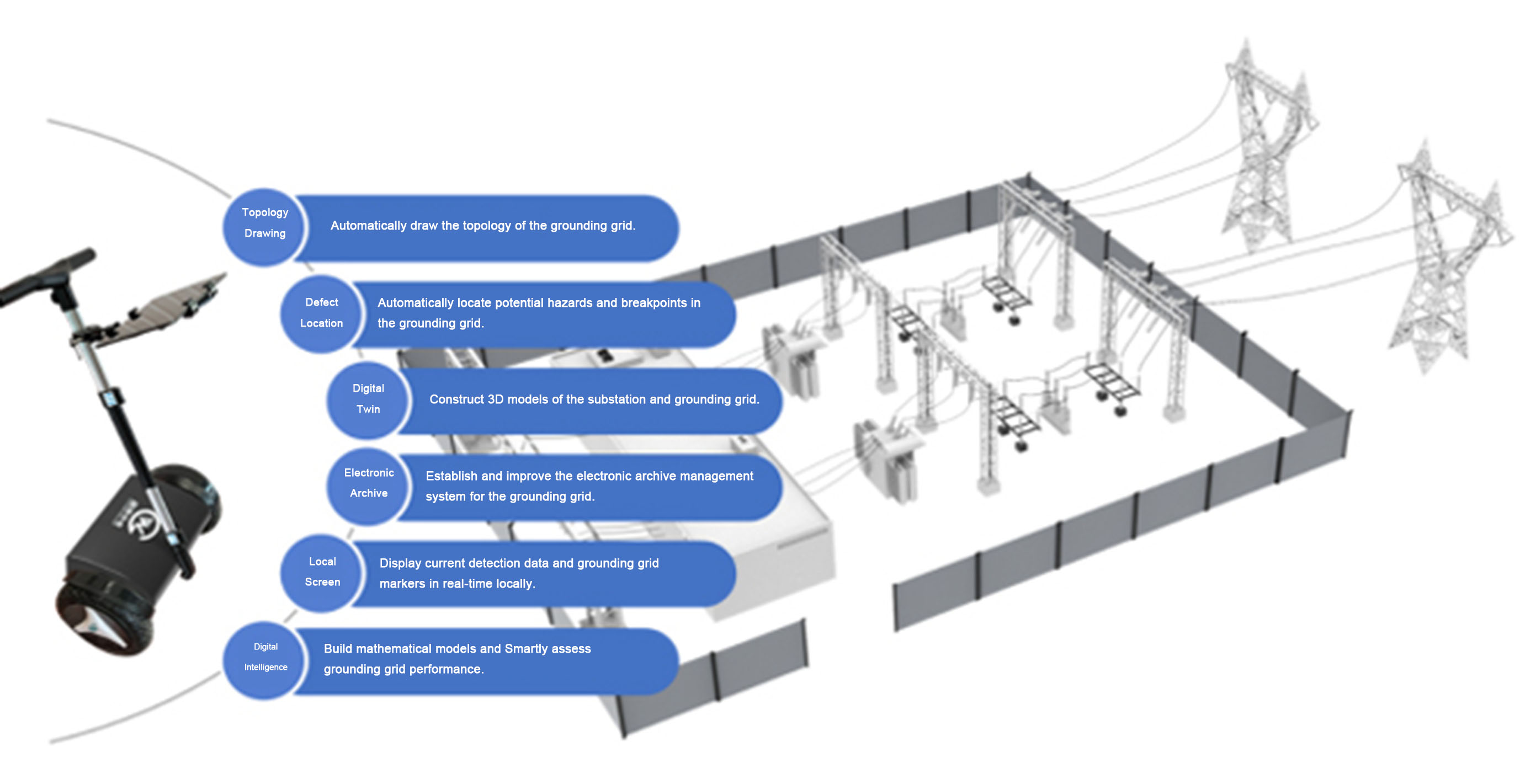 The substation grounding grid condition detection system injects variable-frequency excitation current into the grounding grid through surface grounding down conductors. It measures the induced surface magnetic flux density and coordinates, employs differential algorithm-based detection to generate topological diagrams, conducts corrosion analysis and defect localization for horizontal grounding grids, providing basis and decision-making support for on-site excavation.