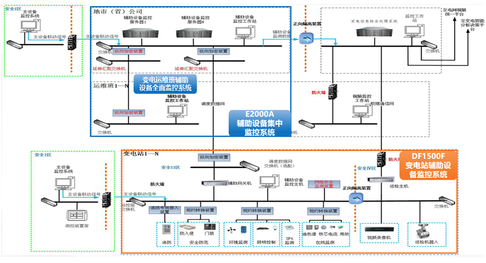 辅助设备监控系统包含一次设备在线监测子系统、火灾消防子系统、安全防卫子系统、动环子系统、智能锁控子系统、智能巡视子系统等,实现一次设备在线监测、火灾报警、安全警卫、动力环境监视及控制、智能锁控、图像监视信息的分类存储、智能联动及综合展示等功能。一次设备在线监测、火灾消防、安全防卫、动环、智能锁控子系统部署于安全Ⅱ区,无线传感器接入及智能巡视子系统部署于安全Ⅳ区。安全Ⅱ区与安全Ⅳ区之间通过正、反向隔离装置互联。
